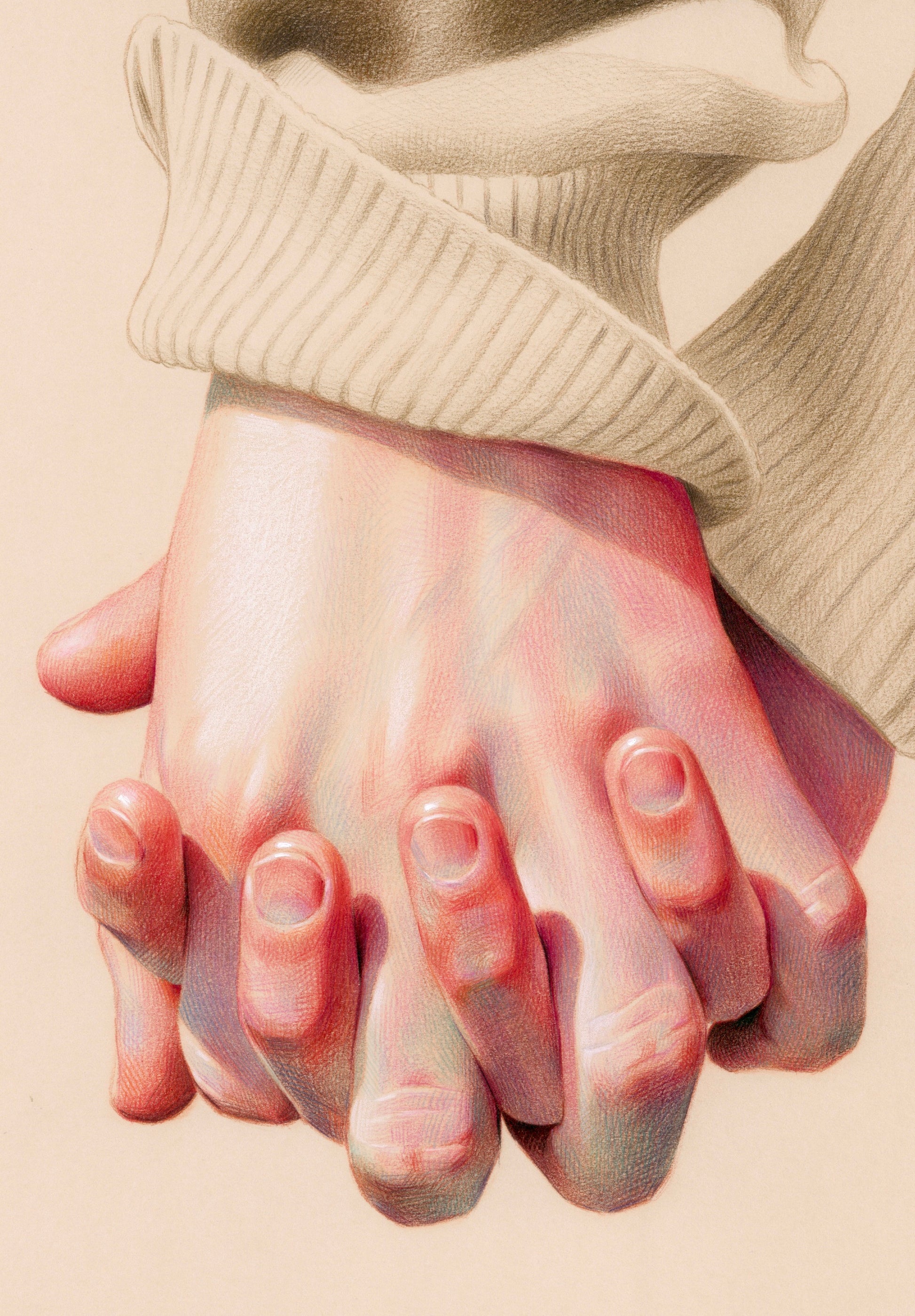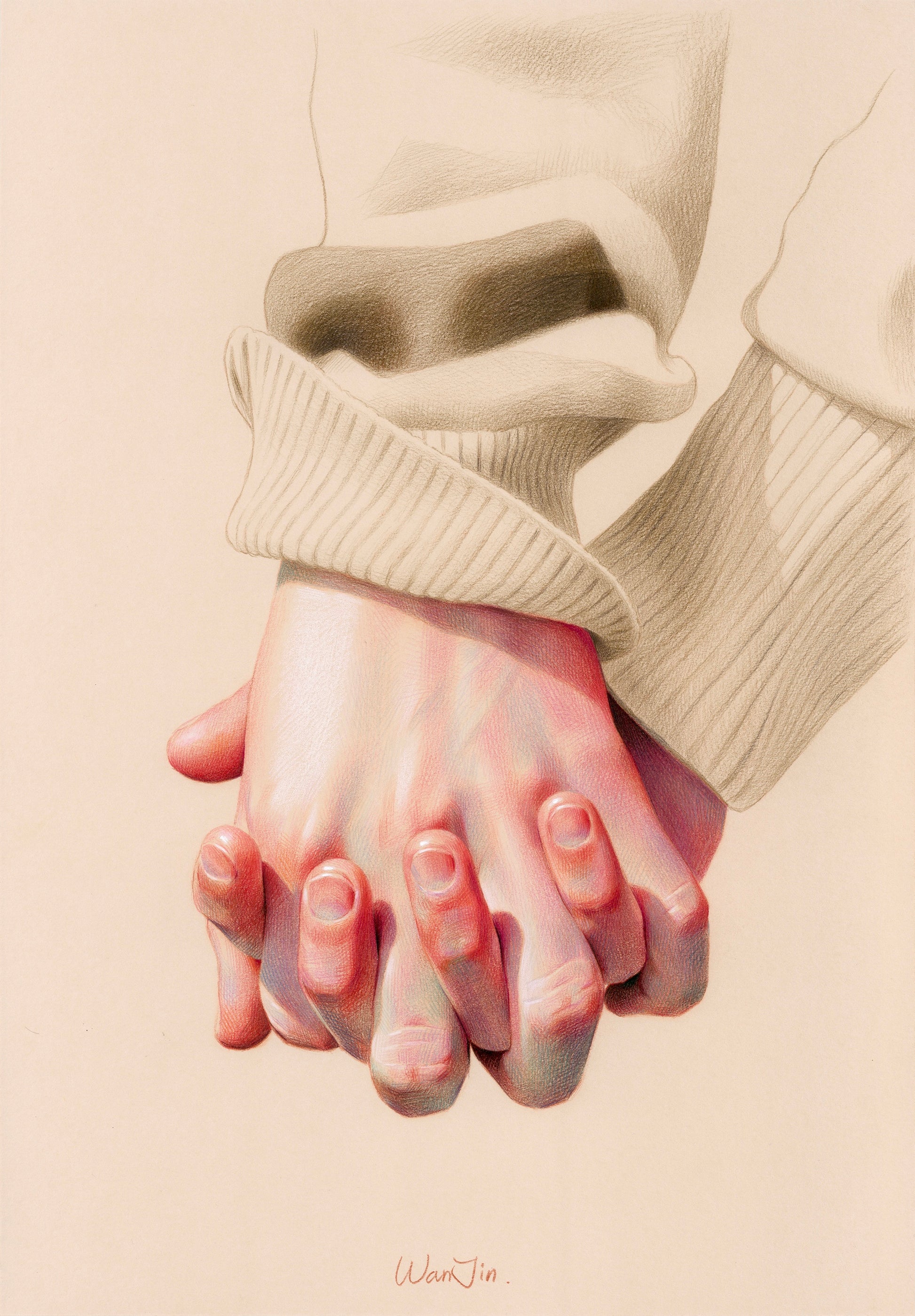 A cozy winter day is a detailed colored pencil drawing that beautifully captures a couple’s holding hands on a chilly yet sunlit winter day. It portrays the moment where the shared warmth and excitement make them forget the cold, with the textured sweaters further enhancing the snug and cozy feel of the piece. This artwork brings an everlasting coziness to your own collection and serves as a meaningful gift for someone special.
