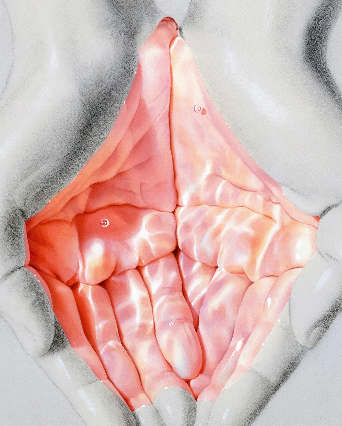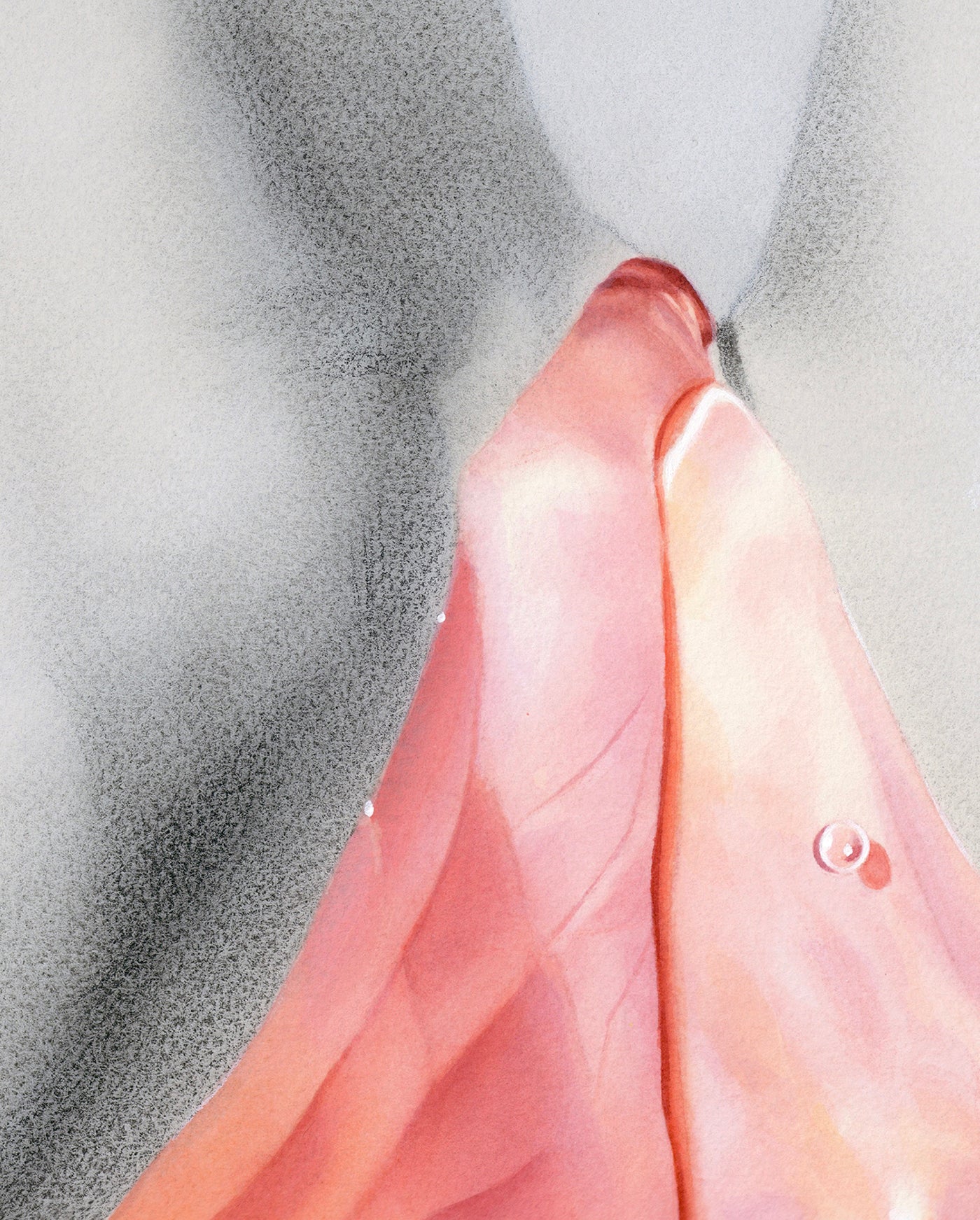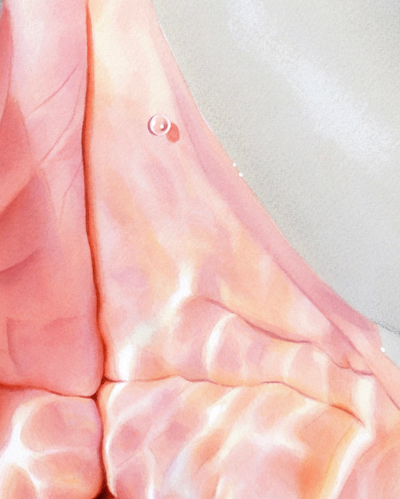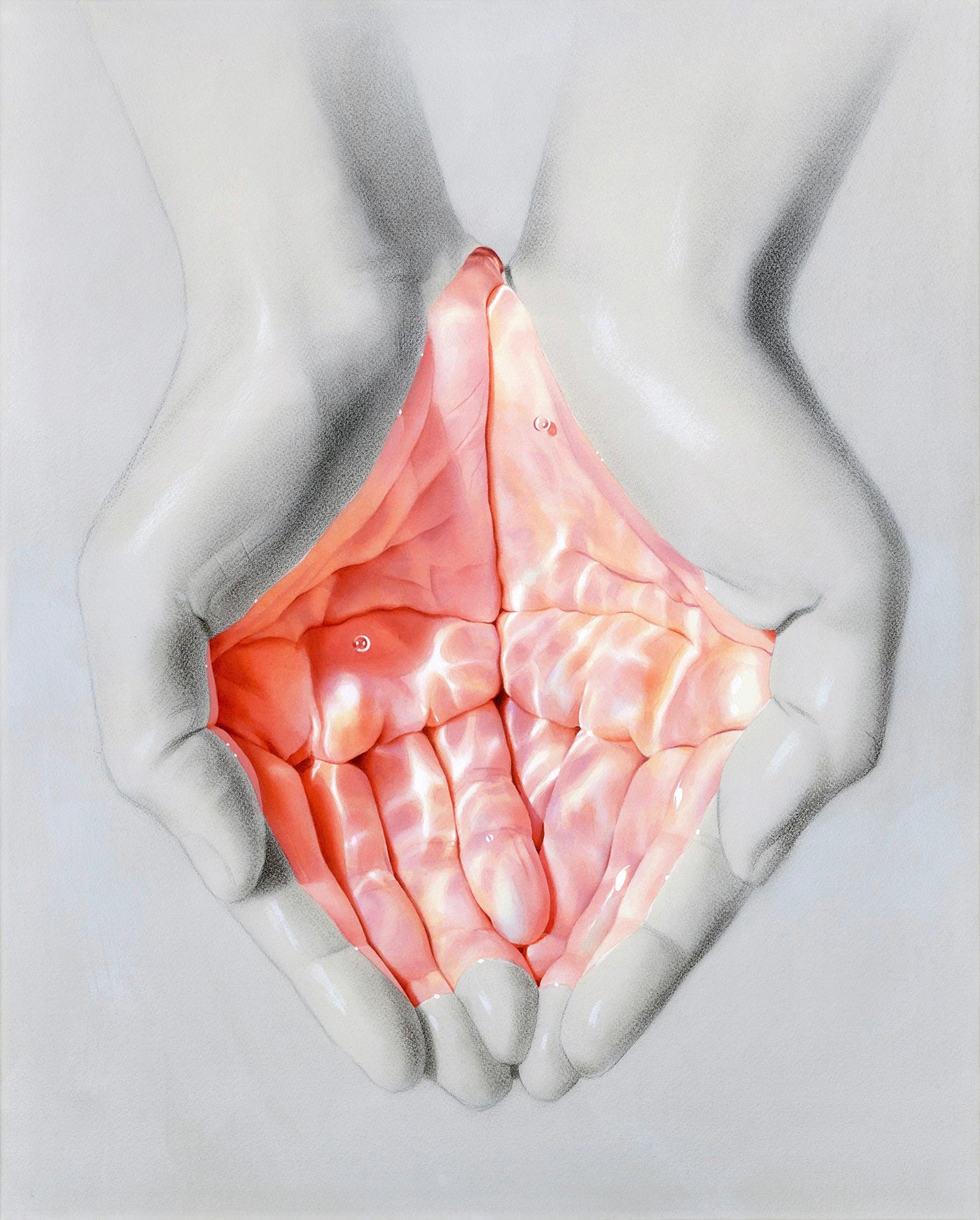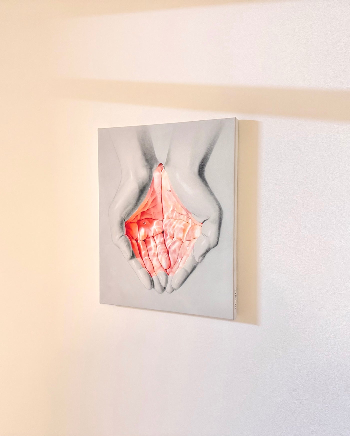 The central water area depicts the light passing through the water by building up multiple layers of transparent touches of acrylic diluted with a large amount of water. After that, to create a contrast with the central area, the surrounding area was underpainted with acrylic used opaquely, and the hands were depicted with colored pencil. The work was completed with the artist’s final act of signing it on the side.